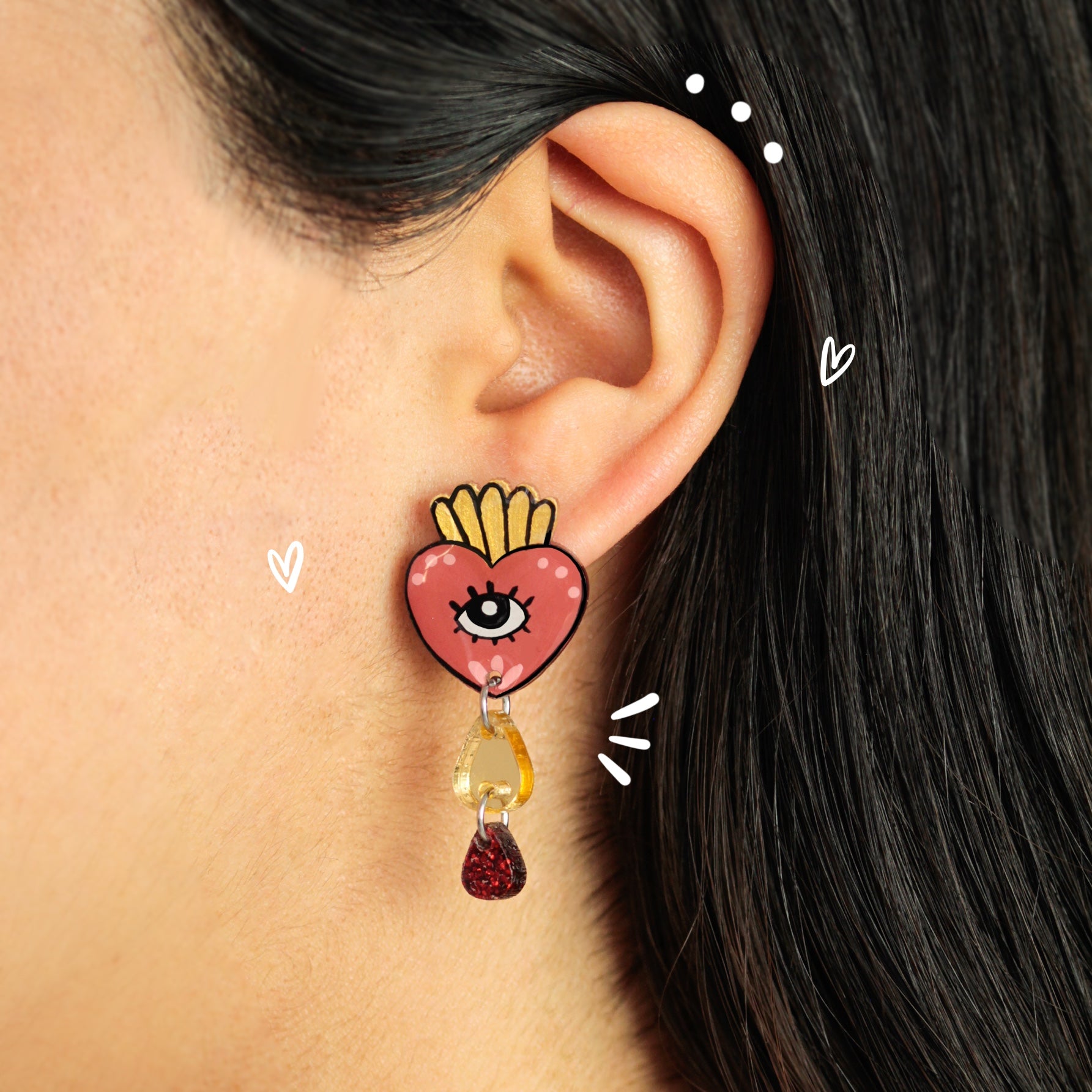 Deja que este par sean los protagonistas, por su tamaño, colores y movimiento sin duda se convertirán en el centro de atención de cualquier look. Pintados con mucho amor cada pendiente está lleno de creatividad y pequeños detalles que los hace únicos. Son super combinables y muy ligeros.