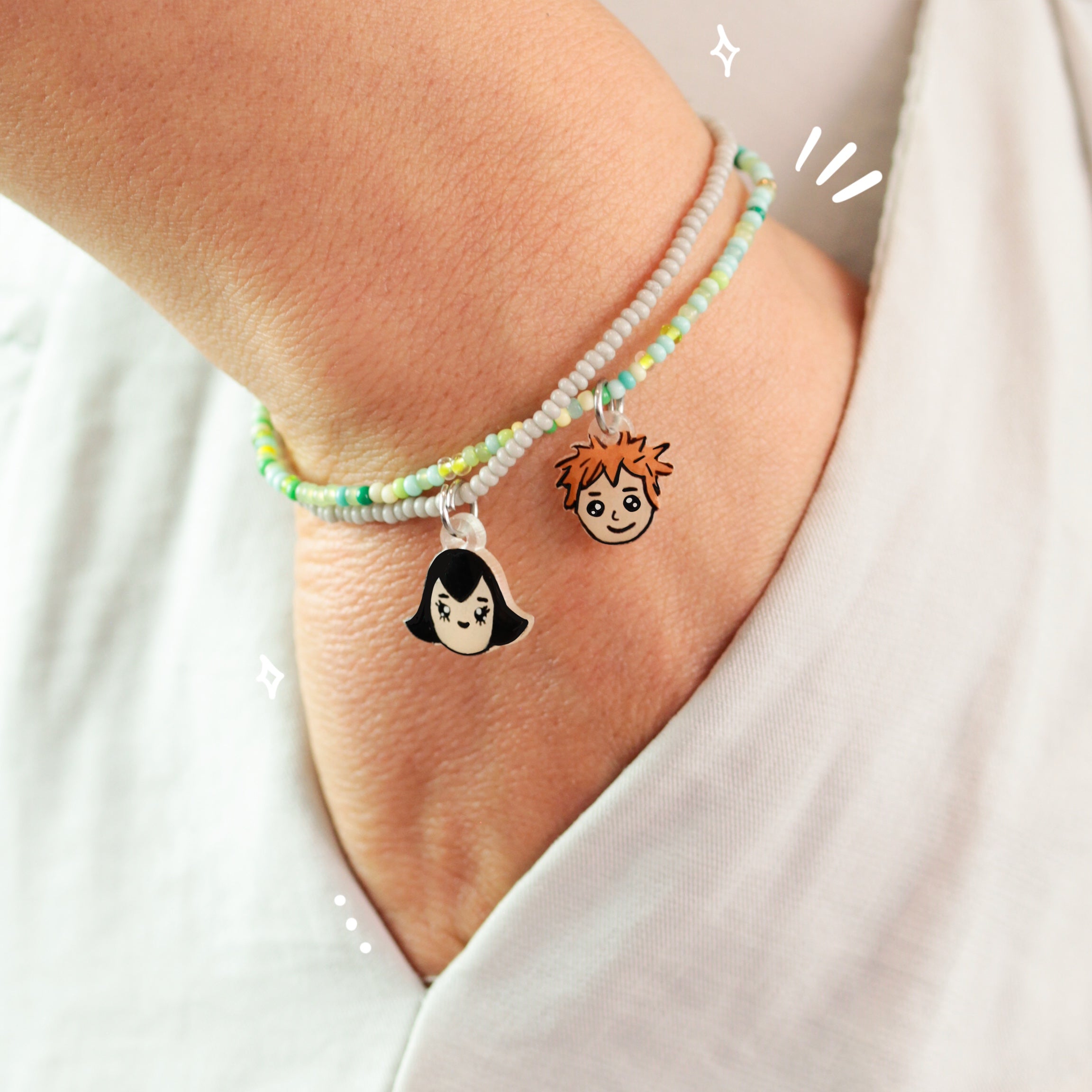 Material: Pulseras elaboradas con cuentas y elástico, con un pequeño remate en chapa de oro, acompañadas de dijes temáticos elaborados y pintados a mano, cuentan con un recubrimiento epoxi que les brinda durabilidad.