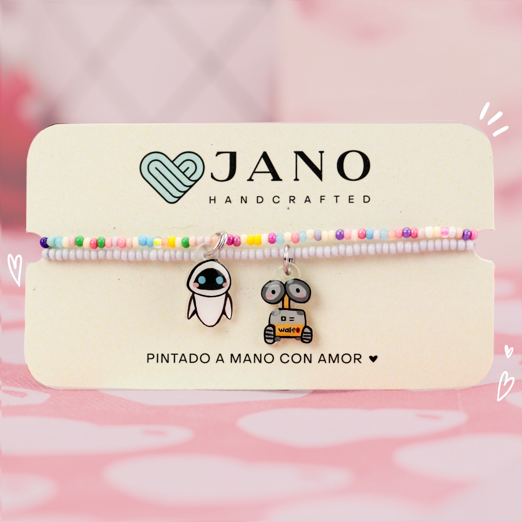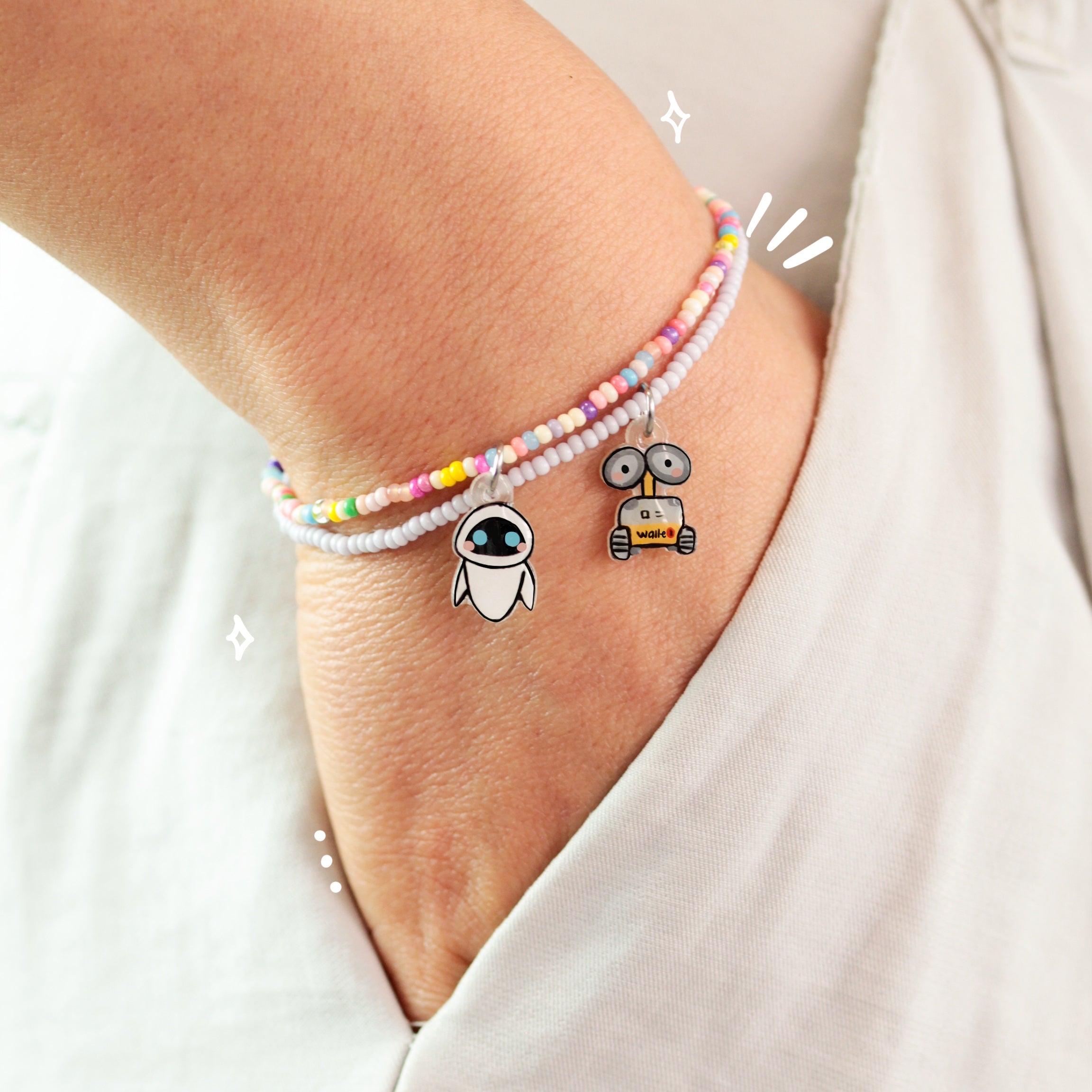 Material: Pulseras elaboradas con cuentas y elástico, con un pequeño remate en chapa de oro, acompañadas de dijes temáticos elaborados y pintados a mano, cuentan con un recubrimiento epoxi que les brinda durabilidad.