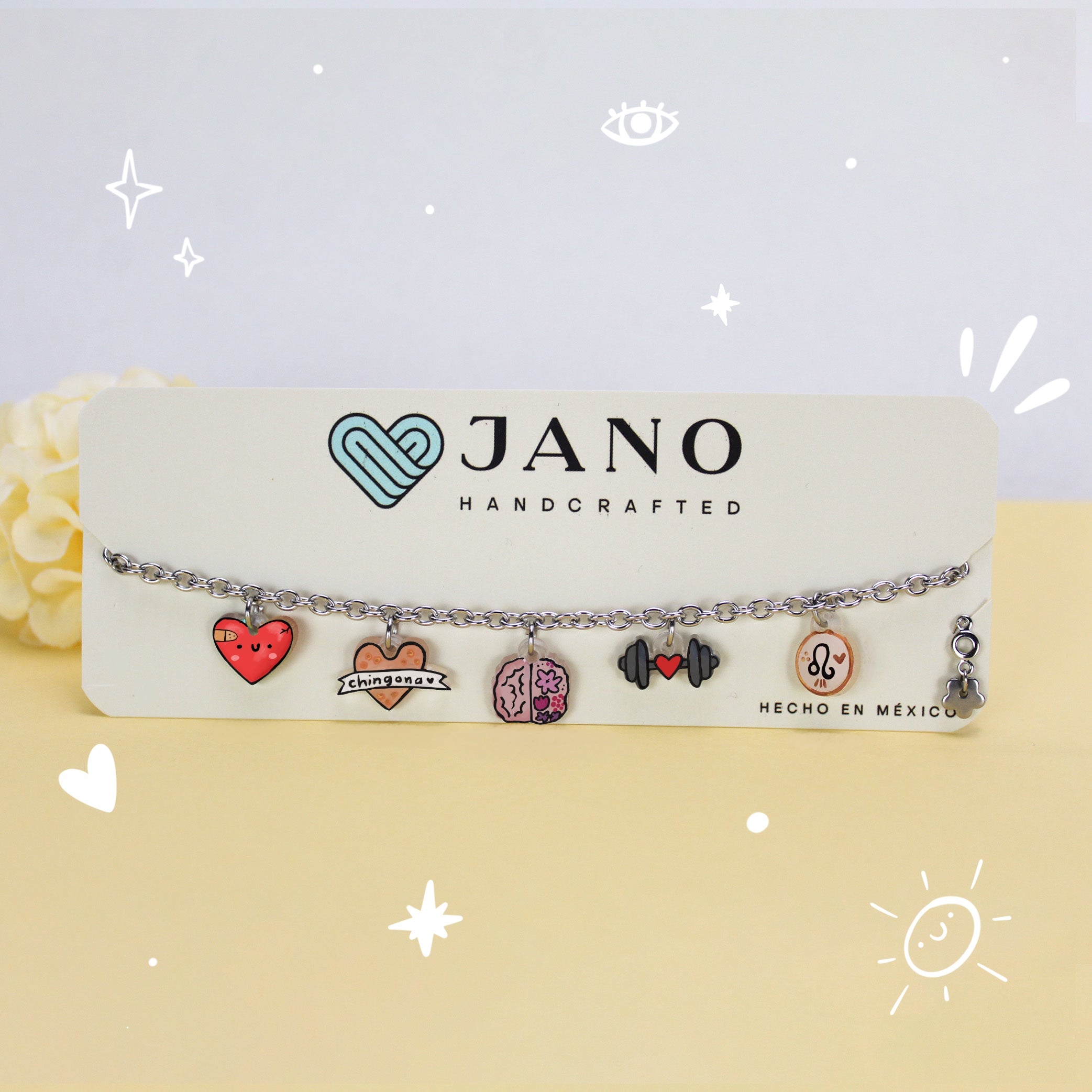 Material: Pulsera de acero inoxidable , acompañada de dijes temáticos elaborados y pintados a mano.