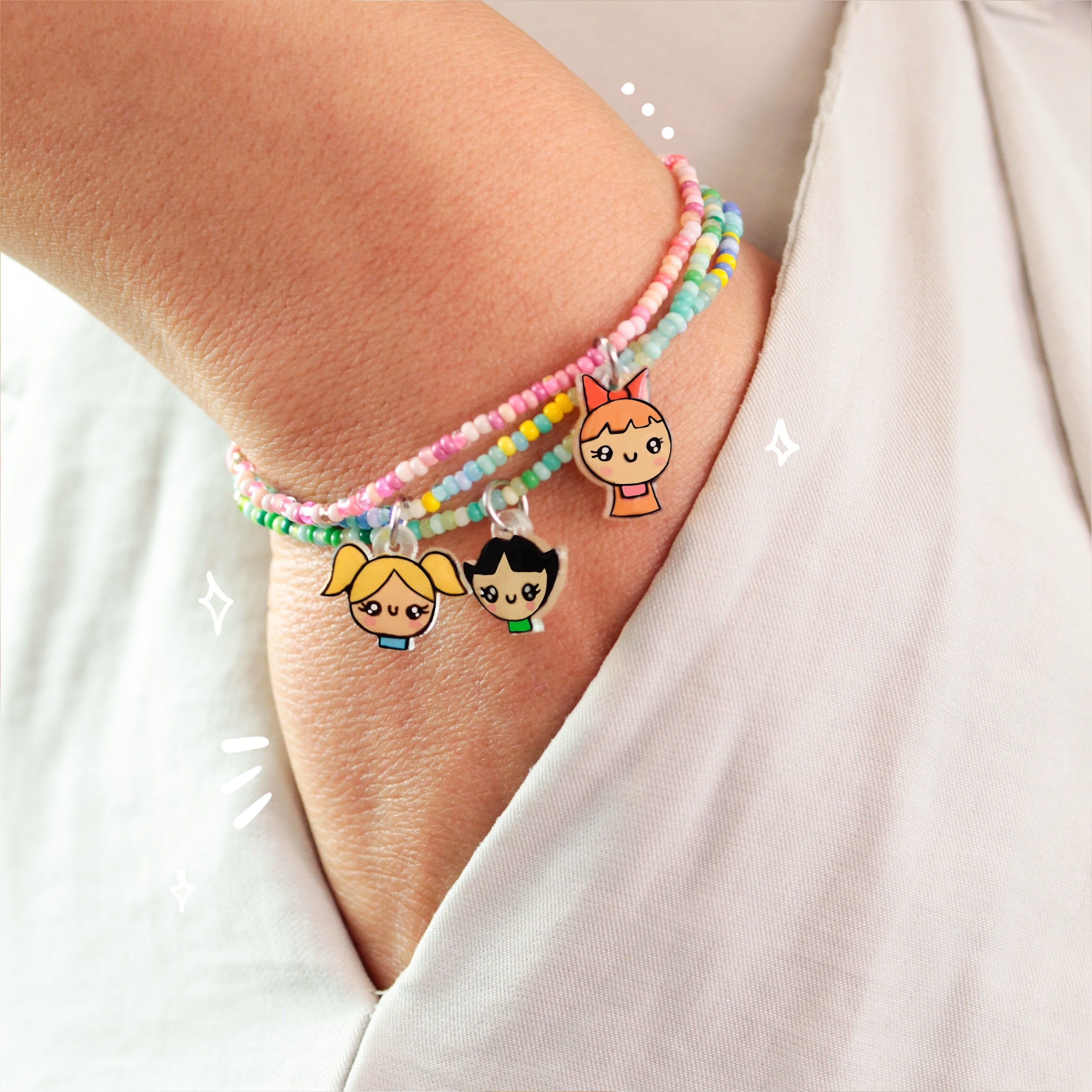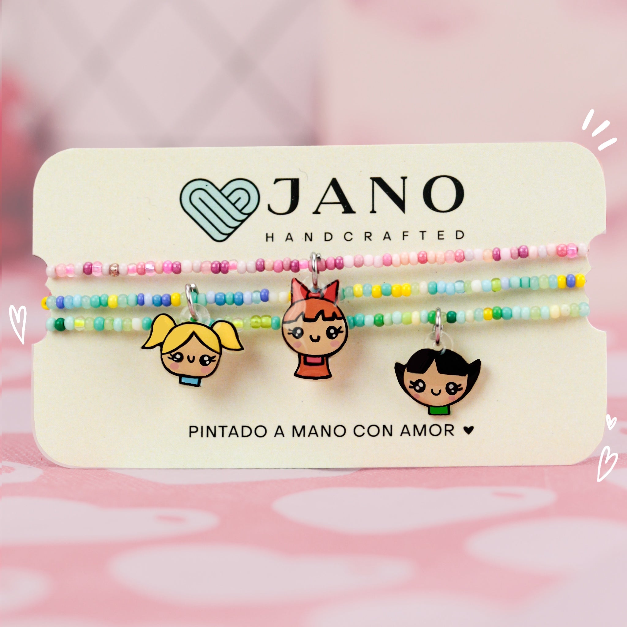 Material: Pulseras elaboradas con cuentas y elástico, con un pequeño remate en chapa de oro, acompañadas de dijes temáticos elaborados y pintados a mano, cuentan con un recubrimiento epoxi que les brinda durabilidad.