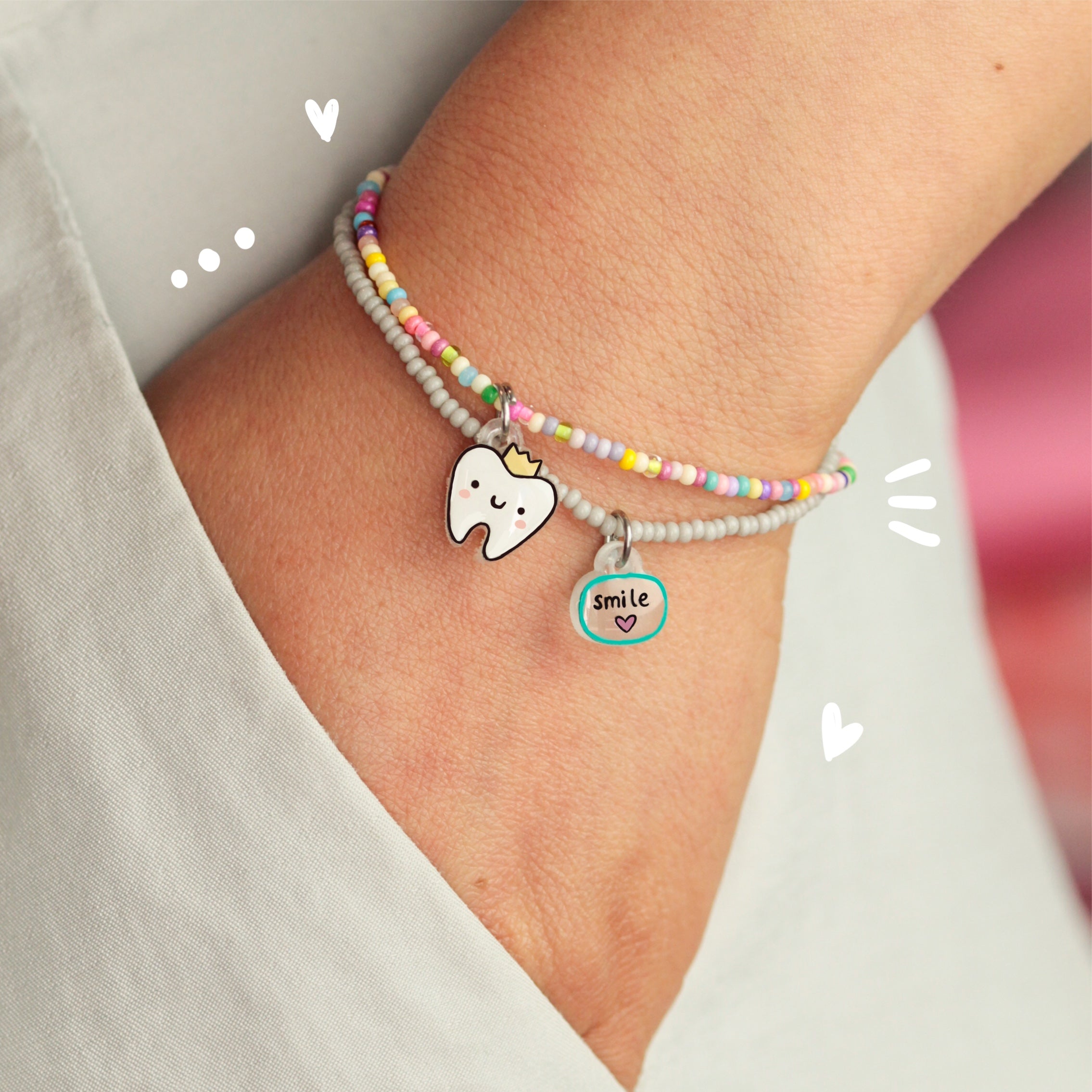 Material: Pulseras elaboradas con cuentas y elástico, con un pequeño remate en chapa de oro, acompañadas de dijes temáticos elaborados y pintados a mano, cuentan con un recubrimiento epoxi que les brinda durabilidad.