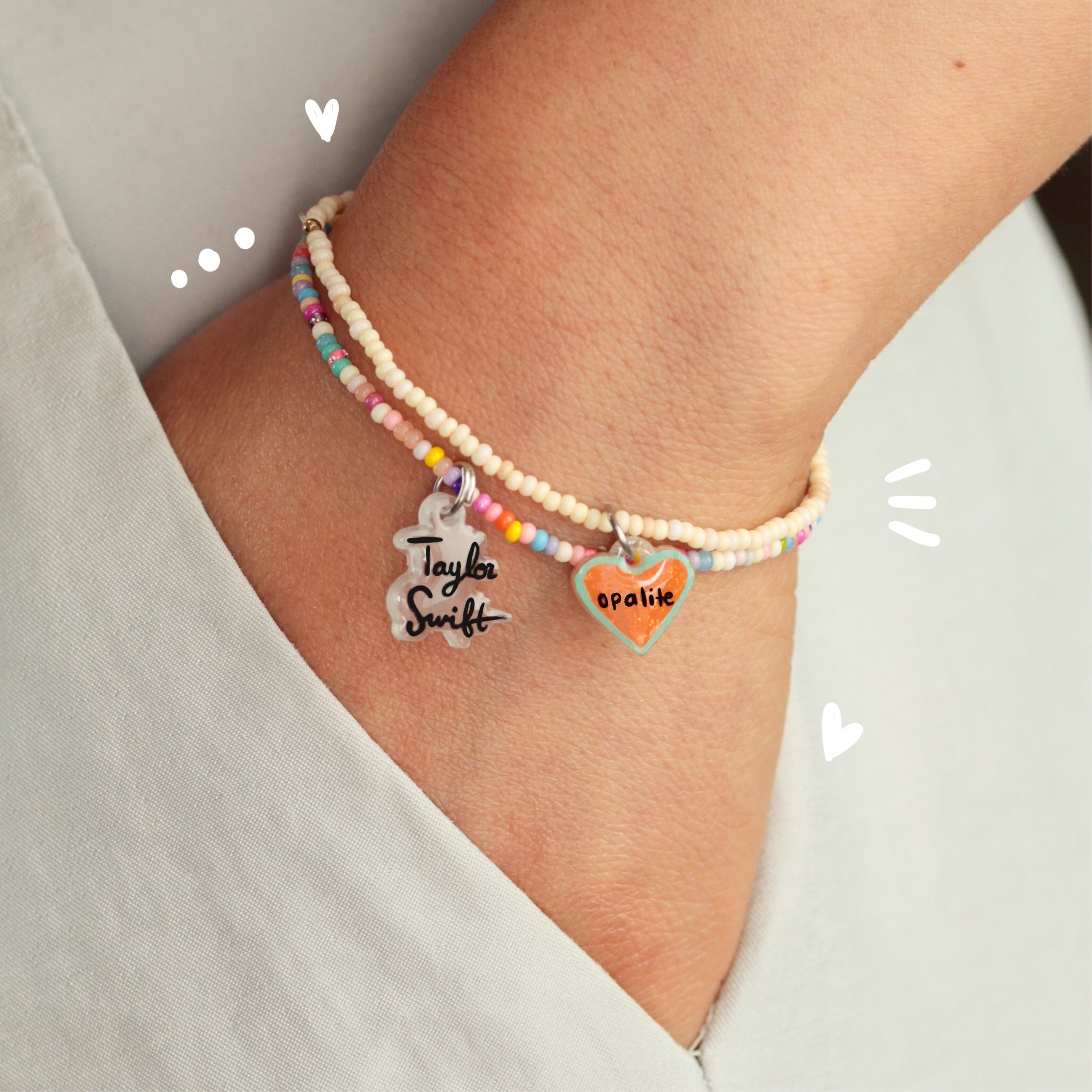 Material: Pulseras elaboradas con cuentas y elástico, con un pequeño remate en chapa de oro, acompañadas de dijes temáticos elaborados y pintados a mano, cuentan con un recubrimiento epoxi que les brinda durabilidad.