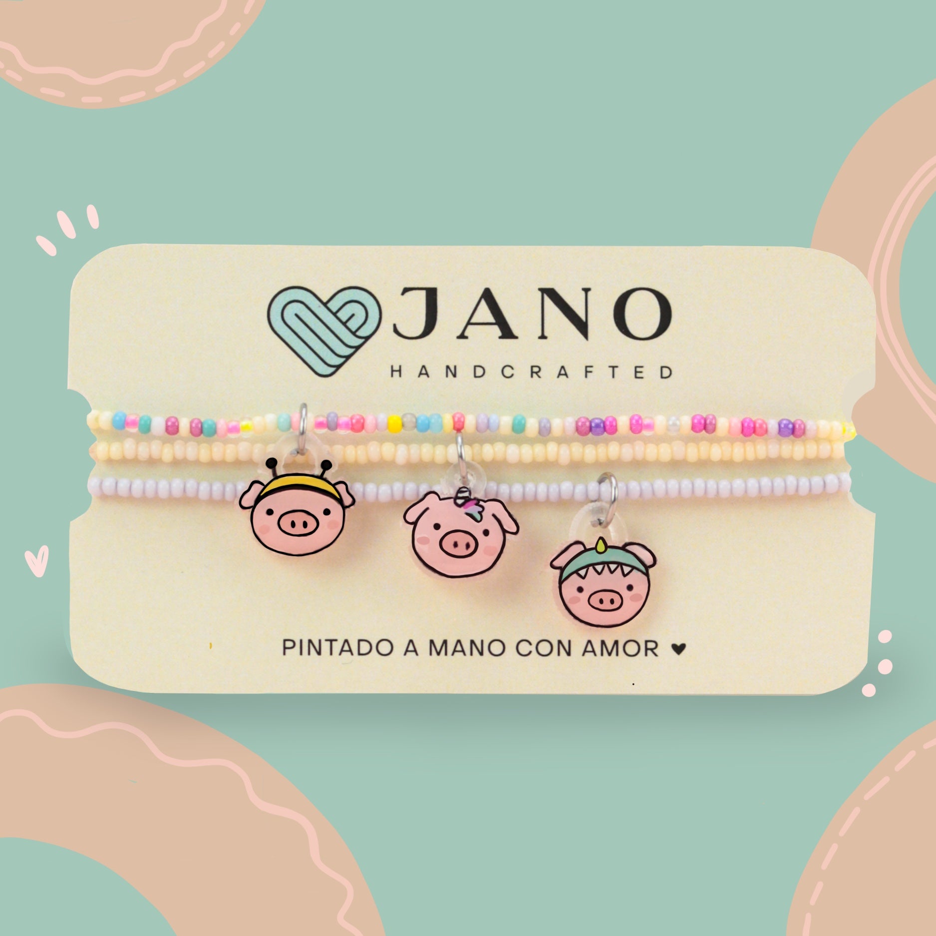 Material: Pulseras elaboradas con cuentas y elástico, con un pequeño remate en chapa de oro, acompañadas de dijes temáticos elaborados y pintados a mano, cuentan con un recubrimiento epoxi que les brinda durabilidad.