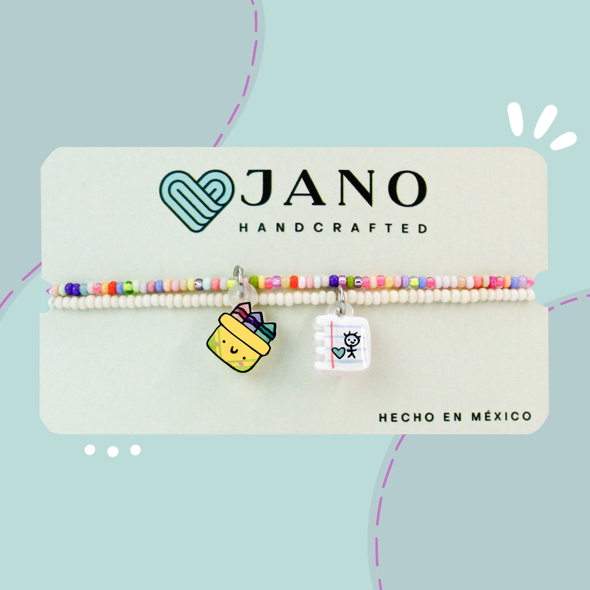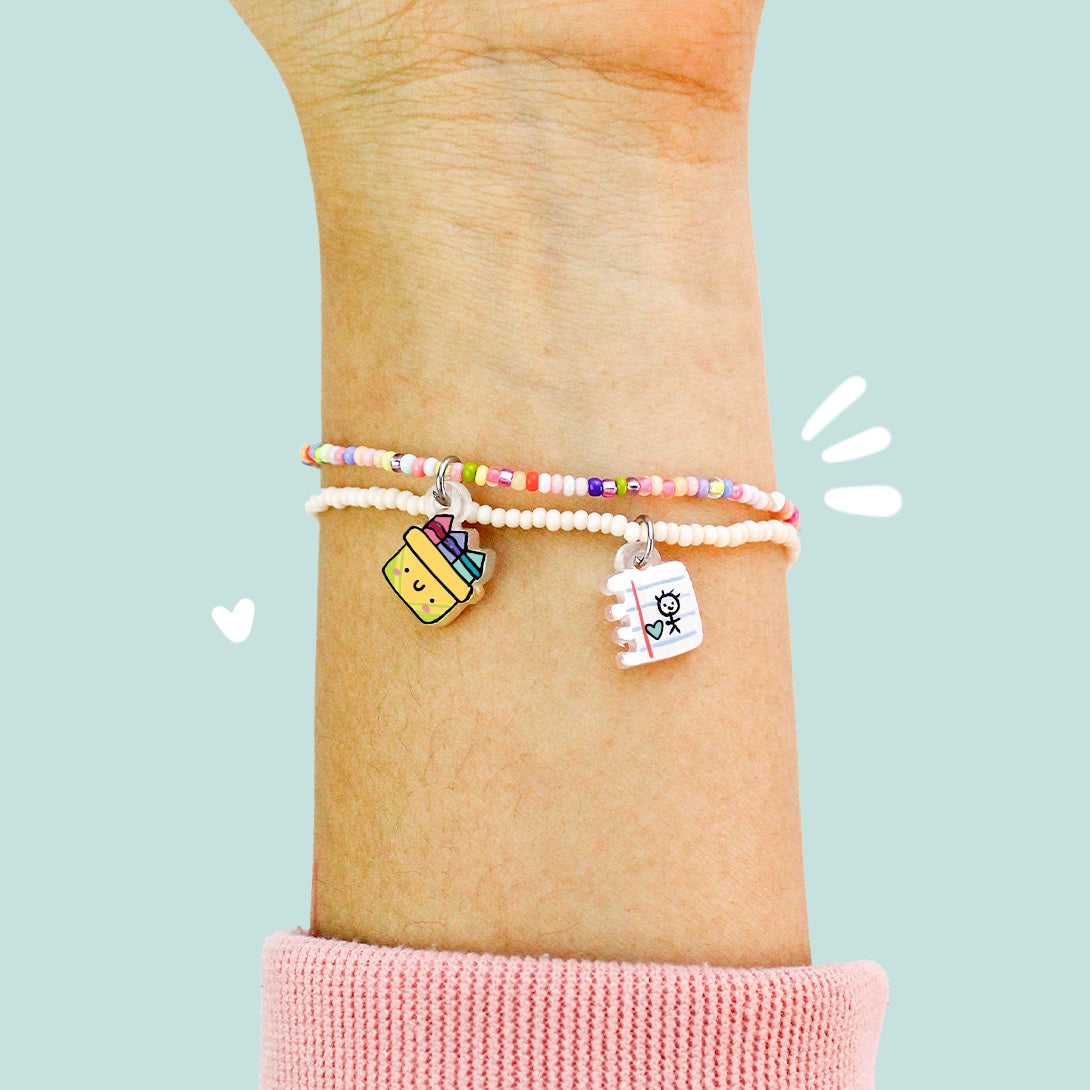 Material: Pulseras elaboradas con cuentas y elástico, con un pequeño remate en chapa de oro, acompañadas de dijes temáticos elaborados y pintados a mano, cuentan con un recubrimiento epoxi que les brinda durabilidad.