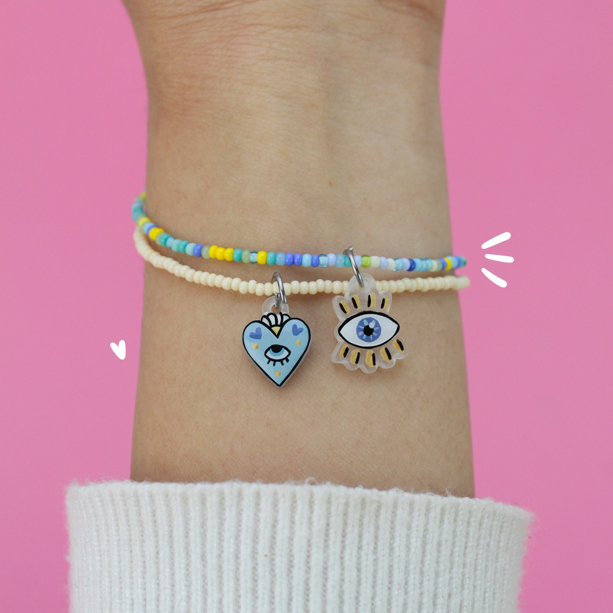 Material: Pulseras elaboradas con cuentas y elástico, con un pequeño remate en chapa de oro, acompañadas de dijes temáticos elaborados y pintados a mano, cuentan con un recubrimiento epoxi que les brinda durabilidad.