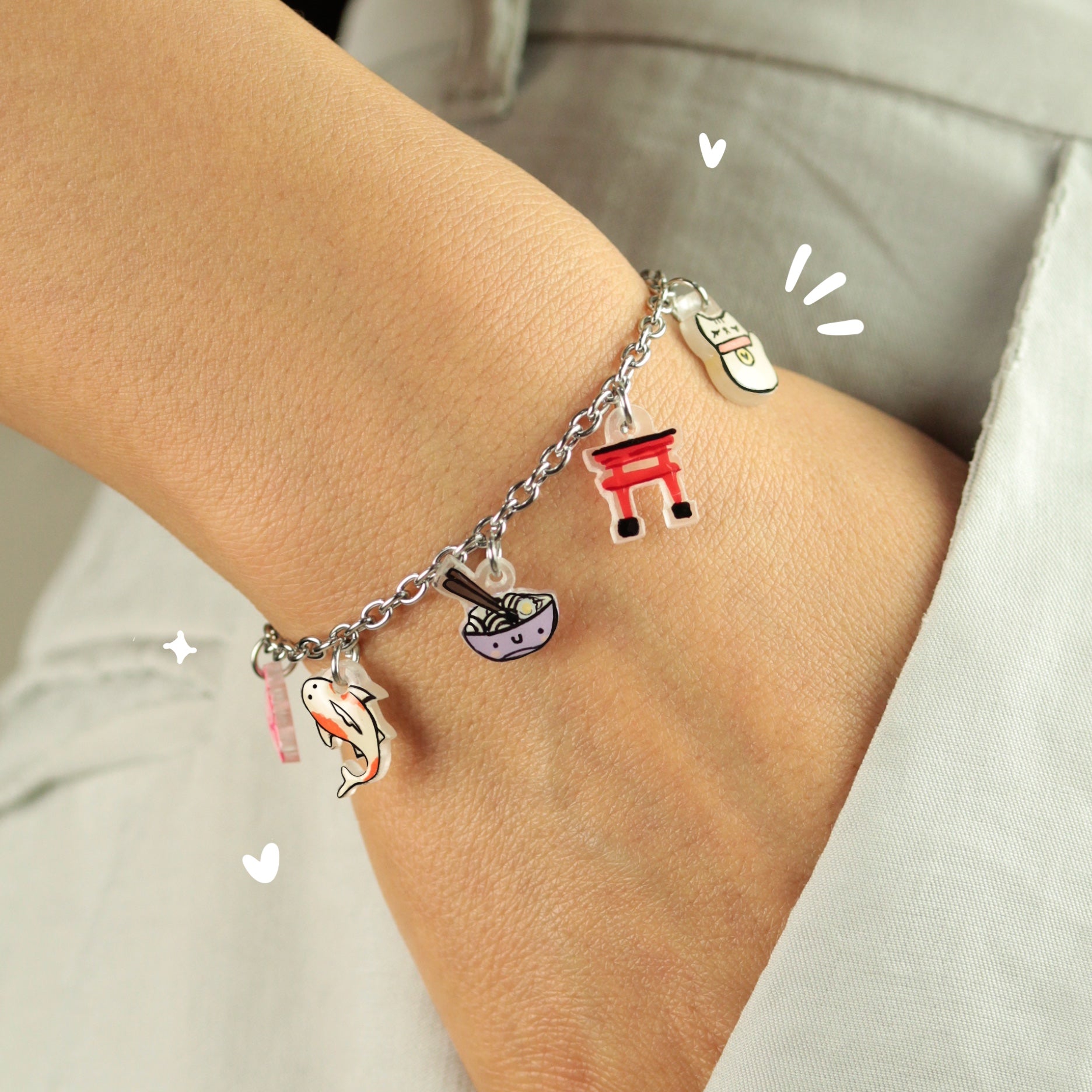 Material: Pulsera de acero inoxidable , acompañada de dijes temáticos elaborados y pintados a mano.